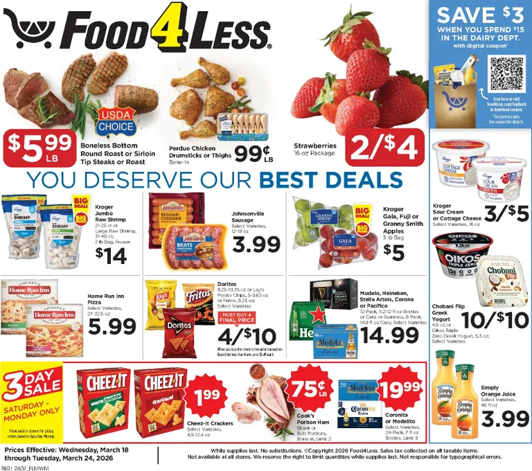 You’re viewing the Food 4 Less weekly ad, valid from 03/18/2026 to 03/24/2026. Visit our website regularly to stay up to date with the latest deals and promotions from your favorite stores.