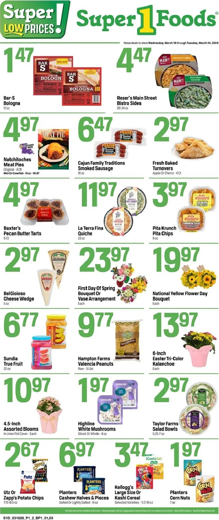You’re viewing the Super 1 Foods weekly ad, valid from 03/18/2026 to 03/24/2026. Visit our website regularly to stay up to date with the latest deals and promotions from your favorite stores.